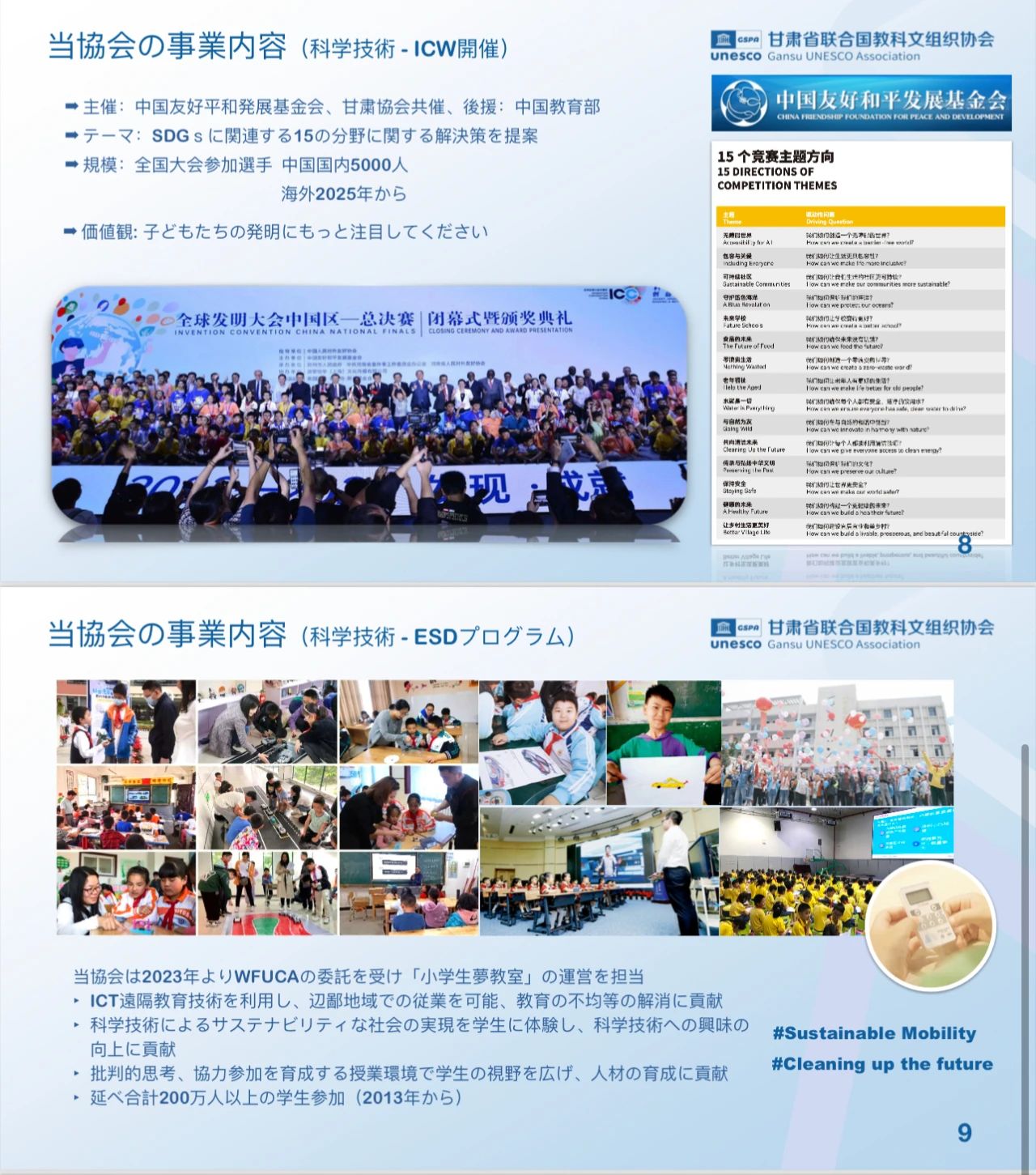 Yuji SUZUKI 总干事对杜永军会长一行的到访表示欢迎,他介绍指出,日本的第一个联合国教科文组织俱乐部,是1947年7月19日在仙台成立的,当时是联合国教科文组织成立不久,多个国家的人民出于对教科文组织倡议的理想和热情,自发开展了联合国教科文组织俱乐部民间运动。截止目前,日本全境共有272个教科文组织俱乐部的成员单位,分布在一都、一道、二府、四十三县中,以2017年制定的26年长期愿景“和平为明天——扩展和平之心”为基础,面向2030年可持续发展目标(SDGs)的最终年,团结一致应对国内外教育领域面对的相关挑战,通过“世界寺子屋运动”“灾害儿童教育支持”“U-Smile~大家共同支持儿童计划”等项目,防止因贫困或灾害等原因处于弱势地位的成人和儿童被排除在教育机会之外,并加强国内外的教育合作支持。此外,日本联合国教科文组织协会全国联合会在地区遗产和世界遗产的保护、促进多文化共生、促进与联合国教科文组织相关团体的合作方面发挥着积极的引领与平台作用,助力各俱乐部单位的事业可持续发展。