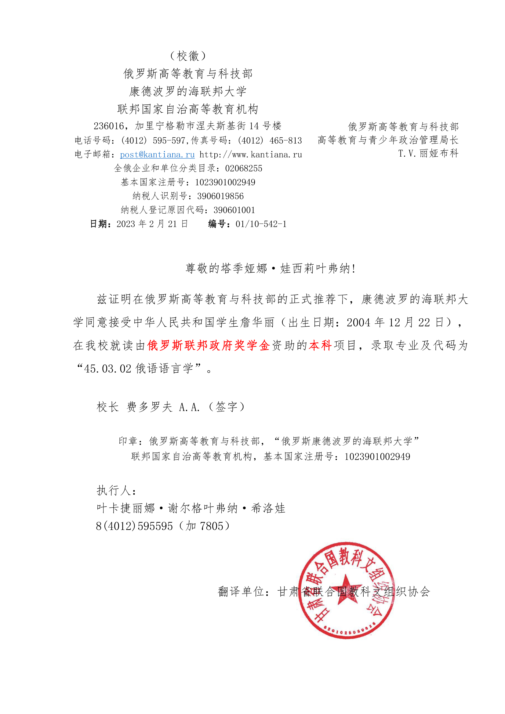 【点赞】王雅轩同学喜获康德波罗的海联邦大学录取!