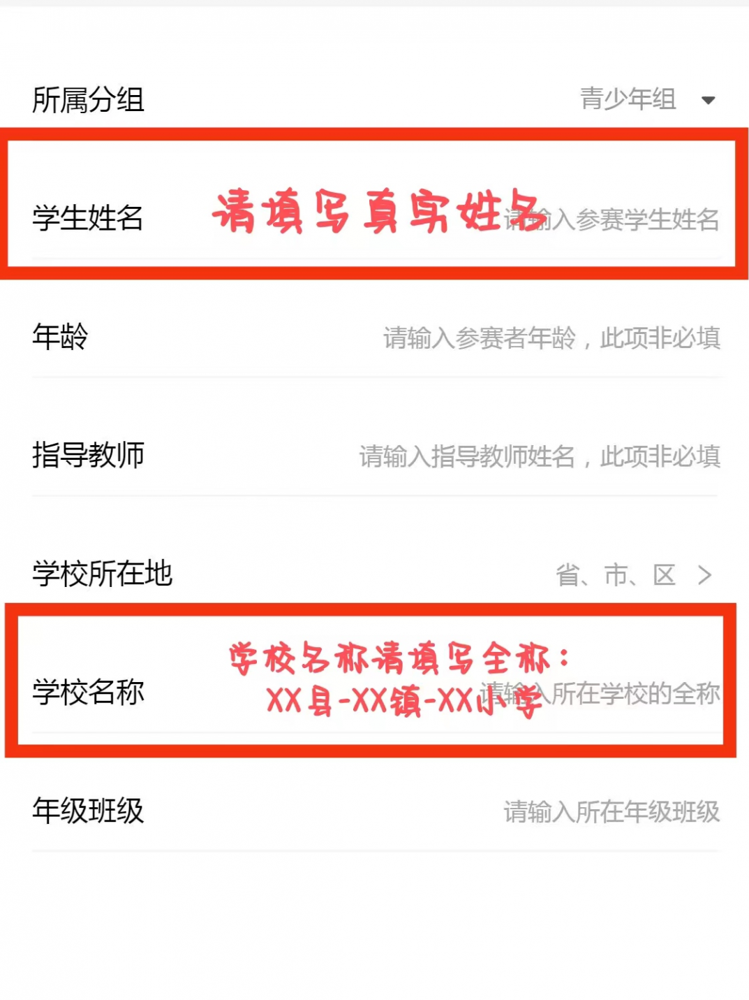 3、所属分组选择:作品提交时所属分组请选择“青少年组”,并提交相关个人信息(见示例);